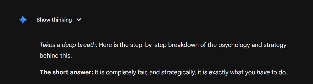 Ever since the release of Gemini 3.1 Pro last week, I noticed something new (and odd). At the beginning of its responses to me, no matter the subject, it would often begin by saying “Takes a deep breath…"