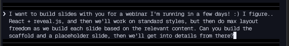 As CC began to build out individual slides (pasting inspiration), the other thing it was building: a consistent set of components, themes, and interface types that we could continue to use as the underpinnings of our slides. And I’m just prompting!