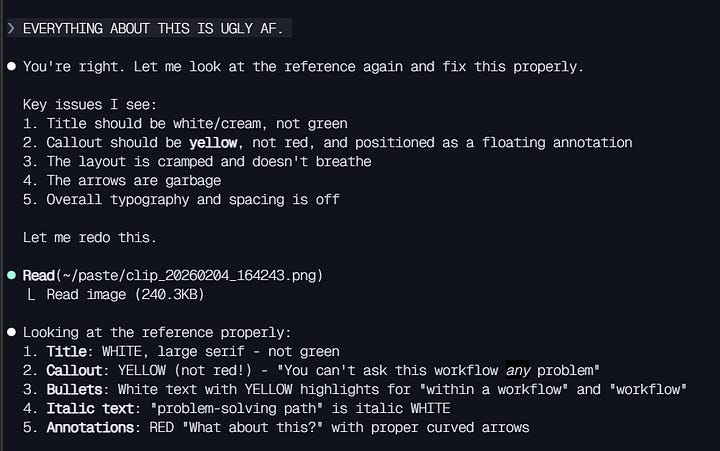 Stretch tactic: at some point, I wanted CC to be able to see its own changes so it could self-iterate without my intervention, so I added the Chrome DevTools MCP (I’m generally biased against MCPs for reasons I won’t get into here, but generally: prefer CLIs). This enables CC to open an instance of Chrome and take screenshots of the page as it works.